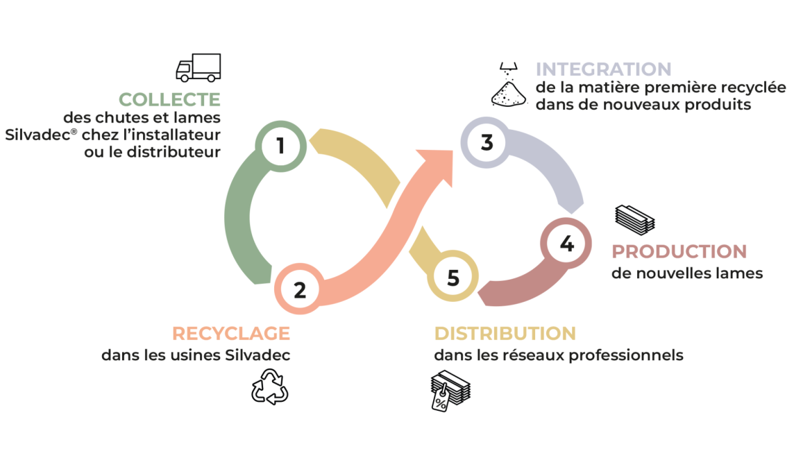 Notre programme en boucle fermée transforme vos chutes de chantier ou ancienne terrasse Silvadec en nouvelles lames made in France, grâce à nos dispositifs de collecte exclusifs et notre unité de production et recyclage intégrée.