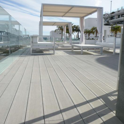 Les lames Élégance et Émotion présentent une structure monoextrudée authentique. Sans enveloppe protectrice, l'aspect bois naturel reste visible et évolue au fil des saisons, nécessitant un entretien périodique adapté. La teinte se patine naturellement avec le temps. L'installation échelonnée, le positionnement de mobilier ou d'éléments décoratifs peut générer des nuances chromatiques entre les différentes zones.
