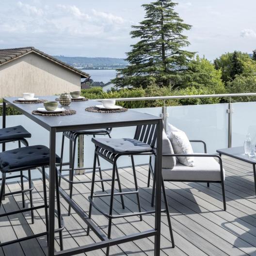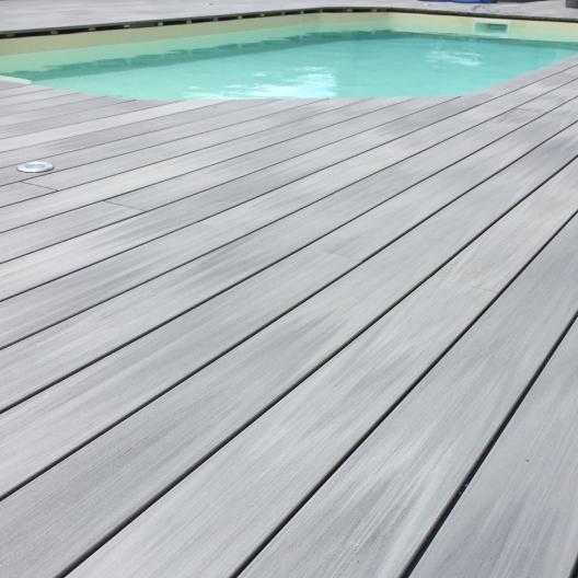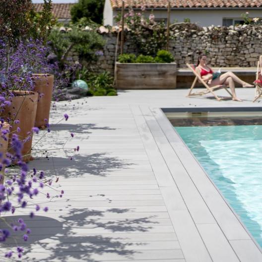 Terrasse en bois composite avec piscine de la Villa Cyrnos en Corse - Aménagement extérieur contemporain avec vue mer et montagne