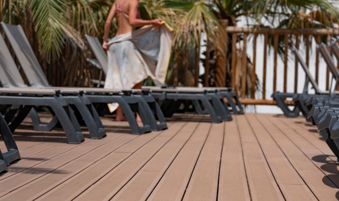 Jeho světlá barva přináší bosým nohám jedinečné pohodlí: jeho teplota na slunci není vyšší než teplota exotického dřeva.